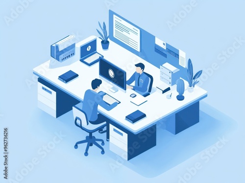 office, workplace, desk, computer, illustration, isometric, people, men at work, person, teamwork, collaboration, co-worker, business, company, work, employee, job, career, professional, team, success, technology, digital, laptop, keyboard, monitor, chair, lamp, plant, document, folder, paper, file, blue, white, graphic, design, software, workspace, productivity, sharpened, concentration, task, meeting, project