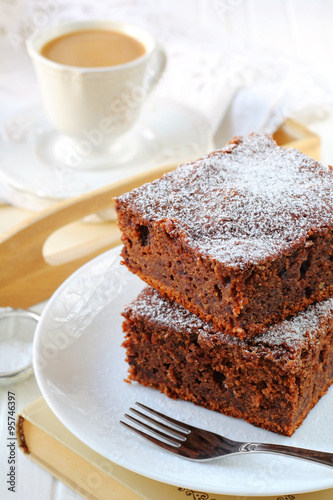 cake, pie, chocolate, food, white, brown, plate, dessert, fork, drink, sweet, epicure, slice, baked, cooked, 2, colours, pastry, part, piece, square, shape, homemade, culinary, sprinkled, sugar, powder, delicious, tasty, cup, hot drink, vertical