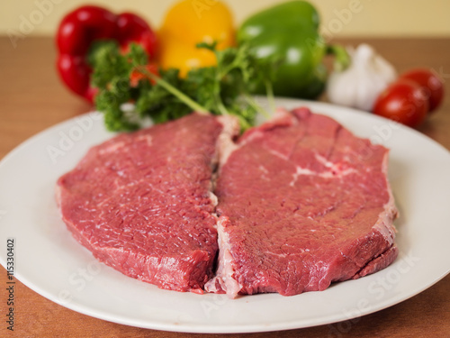 Two pieces of raw beef on a plate and some vegetables in background.