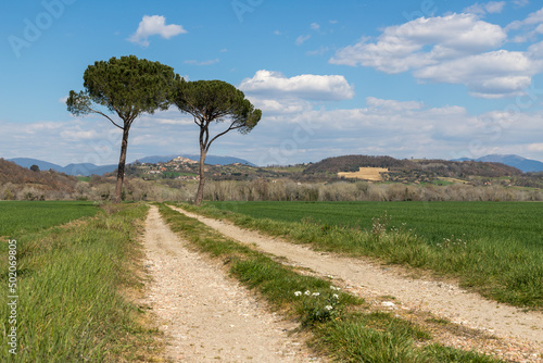 Two pine trees in a field in Lazio, Italy with Apennine mountains in the background and a hilltop town