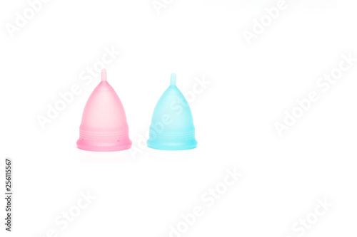 Two pink and blue period menstrual cup on a white background isolated. Concept of women's health, hygienic means of protection, menstruation, ecology of the planet