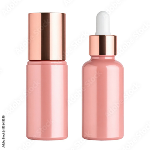 Two pink cosmetic bottles with rose gold caps, one with a pump dispenser and the other with a dropper.