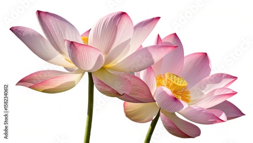 Two pink lotus flowers in full bloom with yellow centers and green stems on a white background