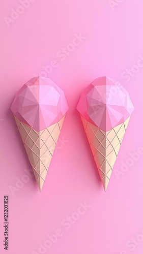 Two Pink Low Poly Ice Cream Cones on Pink Background Summer Dessert Treat