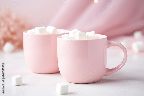 Two pink mugs of cocoa with marshmallows, evoking warmth and holiday cheer, perfect for cozy evenings and festive gatherings.