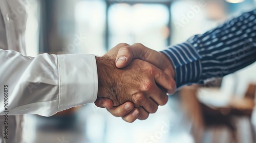 Two professionals shaking hands in agreement, symbolizing partnership and collaboration in a business environment.