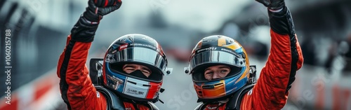 Two race car drivers celebrating a victory on the track in front of a cheering crowd
