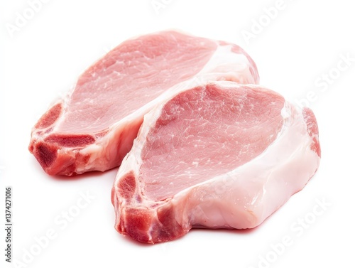 Two raw, perfectly cut pork chops, with their succulent pink meat and delicate marbling, sit side-by-side, poised for culinary transformation.