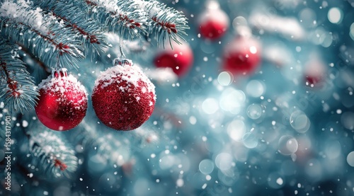 christmas, background, new, year, 2026, red, ornament, tree, tree branch, snow, winter, decoration, festive, holiday, cold, seasonal, closeup, bright, natural, pine, evergreen, winterly, white, weather, celebration, decor, snowy, hanging, scene, banner, poster