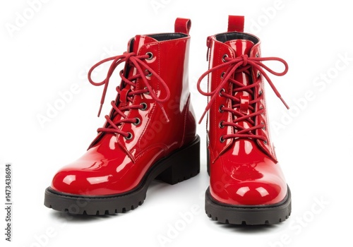 red, patent, leather, boot, ankle, footwear, fashion, style, shiny, glossy, lace, sole, heel, white background, studio shot, pair, contemporary, trendy, closeup, modern, apparel, zip, vibrant, bright, formal, casual attire
