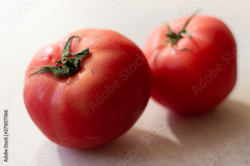 Two red tomatoes on a white background. Two red tomatoes on a white surface