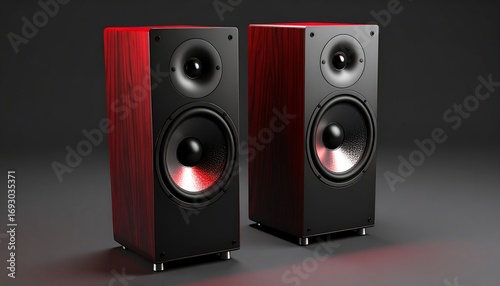 speaker, red, wooden, black, audio, sound, stereo, pair, music, home, theatre, design, modern, technology, three-dimensional, render, product, image, dark, grey, background, illuminated, bass, treble, high fidelity, equipment, portable, high fidelity