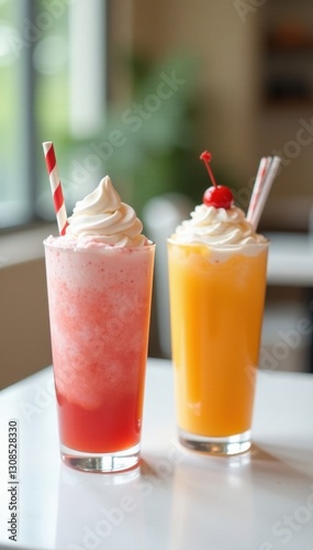Two refreshing drinks on white table, ice cream and milkshake nearby, beverages, food, ice
