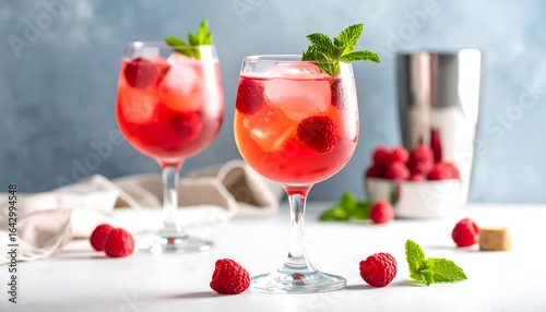 Two refreshing raspberry cocktails with ice and mint garnishes