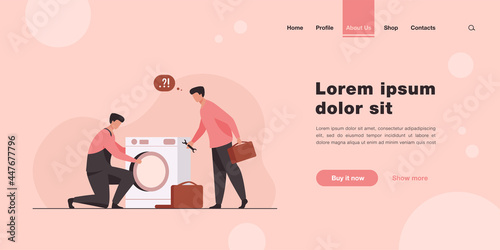 vector, illustration, flat, web, landing, page, template, business, isolated, background, design, element, banner, website, graphic, modern, concept, character, abstract, creative, symbol, cartoon, people, man, 2, handyman, repairman, repairing, fixing, washing, machine, partner, tool, instrument, spanner, wrench, home, appliance, service, maintenance, domestic, work, mentor, intern, kit, box