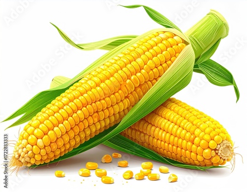 Two ripe ears of bright yellow corn, husked with leaves, and scattered kernels, presented against a clear, white background