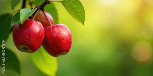Two ripe red apples hanging from a branch in a vibrant green orchard, bathed in warm sunlight, a picturesque scene of natural abundance.
