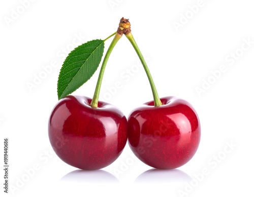 Two ripe, vibrant red cherries with a green leaf against a clean white backdrop