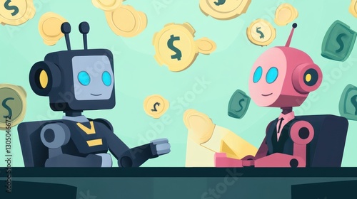 Two Robots Discuss Financial Strategies Amid Floating Currency Symbols