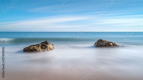 Two Rocks Emerge From Calm Ocean Waters Under Blue Sky