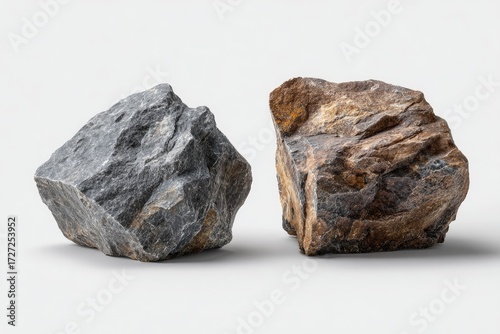 Two rough stones on a white surface