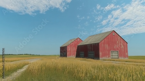 Two Rustic Red Barns Stand in a Golden Field