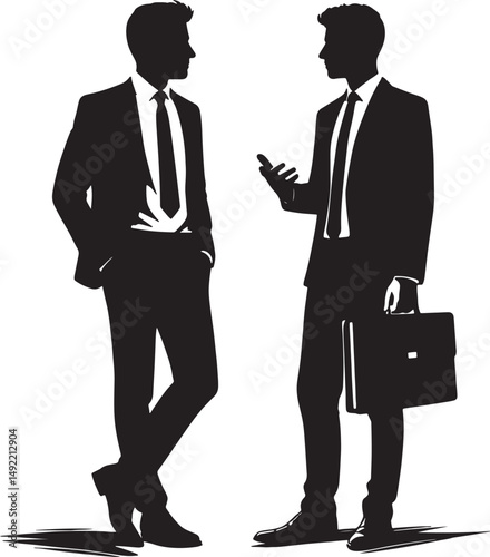 silhouette, businessman, businessman, suit, attaching, conversation, briefcase, corporate, professional, male, man, talking, finance, career, leadership, success, meeting, strategy, negotiation, agreements, partnership, teamwork, communication, discussion, formal, attire, executive, management, planning, investment, analysis, marketing, sale, consulting, monochrome, black, white, minimalist, modern, elegant, stylish, confident, gesture, shadow, holding