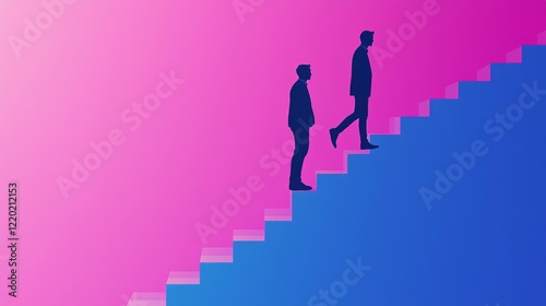 Two Silhouettes Walking Up Bright Color Gradient Stairs Symbolizing Career Growth and Success in Modern Business Environment