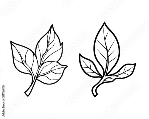 Two simple line art leaves, botanical illustration, white background, design element