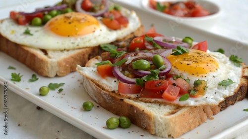 toast, egg, fried, yolk, bread, breakfast, food, meal, cookery, plate, white, dish, tomatoes, onion, red, green, pea, parsley, fresh, healthy, delicious, epicure, culinary, cooking, diet, nourishment, ingredient, vegetable, organic, brunch, lunch, dinner, side, serving, seasoning, pepper, salt, oil, butter, widener, texture, surface, detail, closeup, studio, natural, light, shadow