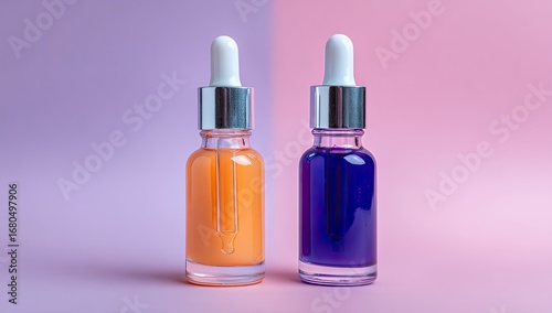Two small, clear glass dropper bottles, one orange, one blue, sit on a lavender-pink gradient background