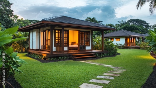 bungalow, tropical, small, modern, house, garden, lush, exterior, twilight, wooden, deck, lawn, pathway, stone, light, warm, peaceful, vacation, get-away, relaxation, private, cosy, asian, japanese, elegant, minimalist, design, architecture, illuminated, evening, tree, palm, plant, green, nature, calm, tranquil, illumination, resort, cabana, hut, studio, accommodation, luxury, retreat
