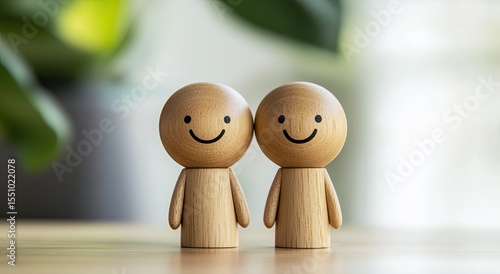 wooden, figure, happy, face, smile, 2, small, figurine, standing, together, close, portrait, positive, joy, friendliness, affection, support, companionship, warmth, simple, cute, charming, adorable, cheerful, light, natural, soft, gentle, peaceful, design, warm, pair, smiling, front, closeup