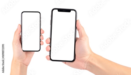 Two smartphones held in hands, isolated on white