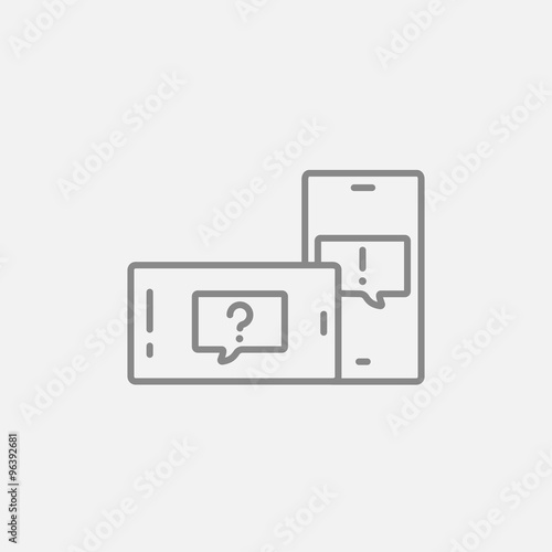 Two smartphones with speech squares on screen line icon.
