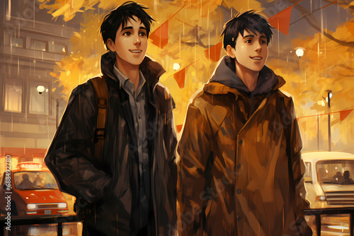 gay, man, together, illustration, couple, human relationships, male, smiling, boyfriend, happy, cartoon, homosexual, love, romantic, man, romance, hug, emotion, 2, character, young, person, lifestyle, colourful, rainbow, people, background, smile, attractive, isolated, adult, flat, affection, care, commitment, engagement, photogenic, day, charming, american, guy, holding, lying, african, happiness, kiss, embracing