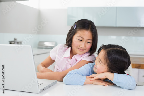 children, girl, female, korean, indoor, copy space, lifestyle, technology, computer, wireless, using, leisure, browsing, cyberspace, laptop, notebook, happy, dark hair, black hair, childhood, casual attire, smile, pretty, house, home, apartment, domestic, togetherness, together, kitchen, sibling, sister, family, learning, looking