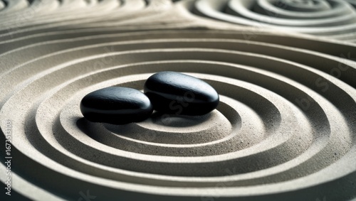 Two smooth stones placed on a Zen garden with concentric ripple patterns, evoking tranquility and meditation.