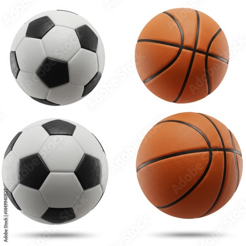 Two soccer balls and two basketballs arranged in a square pattern on a white background studio shot