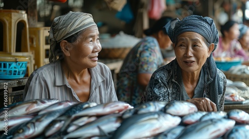 Two Southeast Asian women smiling and chatting beside a fish stall in a vibrant local market, conveying a sense of community and everyday commerce