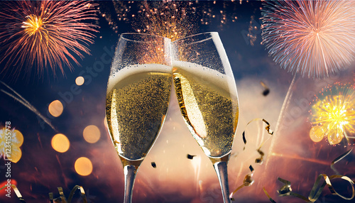 Two sparkling wine glasses filled with bubbly liquid are in the foreground, with a backdrop of fireworks symbolizing a celebratory moment Generative AI