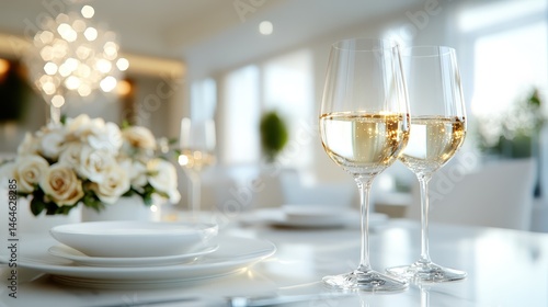 Two sparkling wine glasses sit elegantly on a beautifully set table adorned with fresh flowers, perfect for an intimate dinner or celebration, rich with refined details.