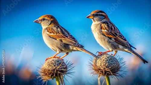 Two sparrows stand poised on dried fax stems, silhouetted against a brilliant blue sky, embodying nature’s quiet elegance in this stunning