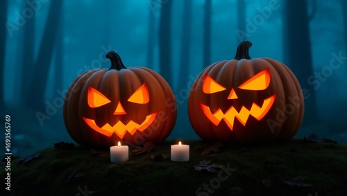 Two spooky carved halloween pumpkins glowing in a dark forest