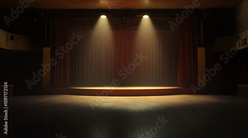 stage, theatre, spotlight, empty, performance, entertainment, curtain, light, dark, wood, floor, auditorium, concert, show, drama, music, acting, art, culture, event, presentation, illuminated, mysterious, quiet, waiting, anticipation, talent, creativity, expression