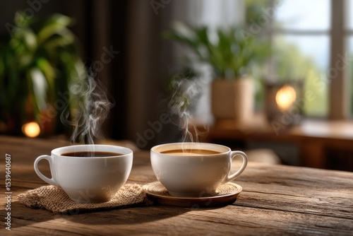 Two steaming cups coffee placed side by side on a rustic wooden table