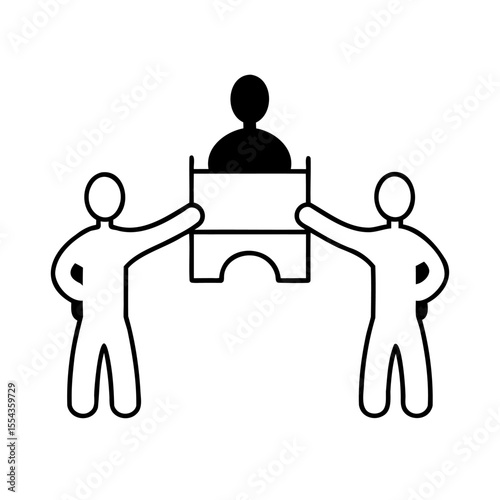 Two stick figures holding a puzzle piece with a person silhouette on background teamwork