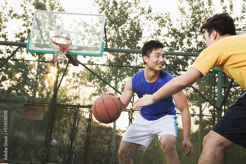 people, motion, control, friendship, cheerful, smiling, toothy smile, city, concentration, endurance, success, expertise, lifestyle, sport, horizontal, half face, outdoors, ball, team sport, professional sport, competitive sport, basketball, basket, running, holding, playing field, court, sky, day, sports team, defending, offence, healthy lifestyle, well-being, fun, playing, beijing, china, color image, dribbling, pitcher, athlete, two people, young men, photo, sportsman