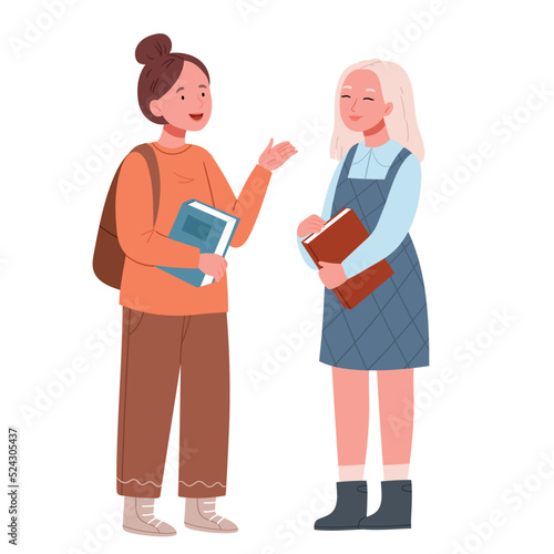 Two stylish girlfriends, schoolgirls are talking.Back to school concept. Hand drawn flat vector illustration isolated on white background.