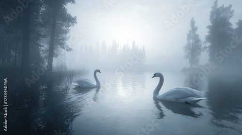 cygnet, lake, mist, fog, sunrise, water, bird, nature, morning, calm, peaceful, serene, tranquil, quiet, elegant, beautiful, graceful, majestic, wildlife, animal, feather, white, tree, forest, landscape, scenery, dreamy, magical, mystical, romantic, solitude, stillness, aethereal, twilight, dawn, light, shadow, atmosphere, moody, mysterious, wonder, peace, serenity
